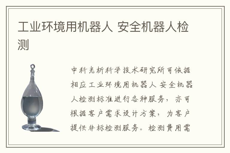 關(guān)鍵詞:工業(yè)環(huán)境用機(jī)器人安全機(jī)器人測(cè)試案例,工業(yè)環(huán)境用機(jī)器人安全機(jī)器人測(cè)試標(biāo)準(zhǔn),工業(yè)環(huán)境用機(jī)器人安全機(jī)器人項(xiàng)目報(bào)價(jià)