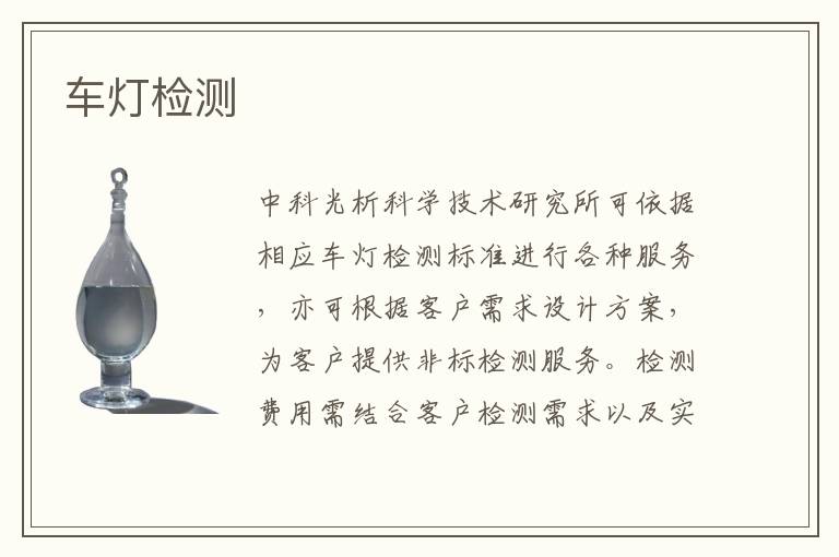 中科光析科學(xué)技術(shù)研究所可依據(jù)相應(yīng)車燈檢測(cè)標(biāo)準(zhǔn)進(jìn)行各種服務(wù),亦可根據(jù)客戶需求設(shè)計(jì)方案,為客戶提供非標(biāo)檢測(cè)服務(wù)。檢測(cè)費(fèi)用需結(jié)合客戶檢測(cè)需求以及實(shí)驗(yàn)復(fù)雜程度進(jìn)行報(bào)價(jià)。