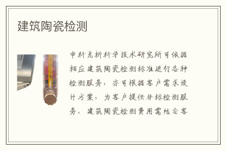 中科光析科學(xué)技術(shù)中析研究所可依據(jù)相應(yīng)建筑陶瓷檢測(cè)標(biāo)準(zhǔn)進(jìn)行各種檢測(cè)服務(wù),亦可根據(jù)客戶需求設(shè)計(jì)方案,為客戶提供非標(biāo)檢測(cè)服務(wù)。建筑陶瓷檢測(cè)費(fèi)用需結(jié)合客戶檢測(cè)需求以及實(shí)驗(yàn)復(fù)雜程度進(jìn)行報(bào)價(jià)。一般7-15個(gè)工作日可出具檢測(cè)報(bào)告。 ```html建筑陶瓷檢測(cè)主要包括對(duì)陶瓷磚和陶瓷板等建筑材料的質(zhì)量性能進(jìn)行評(píng)估。此類檢測(cè)通過(guò)嚴(yán)格的實(shí)驗(yàn)室和現(xiàn)場(chǎng)測(cè)試方法,確保陶瓷產(chǎn)品滿足建筑行業(yè)使用標(biāo)準(zhǔn)和客戶需求,從而保證建筑物的持久性、美觀性和安全性。