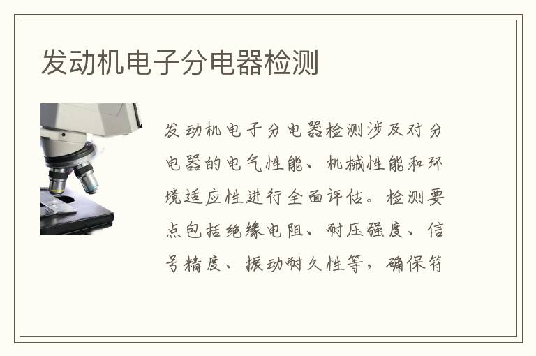 發(fā)動機(jī)電子分電器檢測涉及對點(diǎn)火系統(tǒng)關(guān)鍵部件的全面評估,包括電氣性能、機(jī)械耐久性和環(huán)境適應(yīng)性。檢測要點(diǎn)涵蓋高壓輸出、絕緣電阻、 timing 精度、振動耐受性等,以確保分電器在極端工況下的可靠性和安全性,符合行業(yè)標(biāo)準(zhǔn)要求。