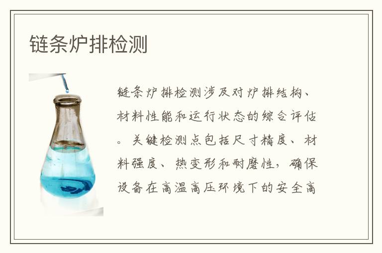 鏈條爐排檢測專注于評估其關(guān)鍵性能指標(biāo),包括尺寸精度、材料機(jī)械性能、熱穩(wěn)定性和運(yùn)行特性,確保符合安全標(biāo)準(zhǔn)和效率要求,涉及無損檢測、力學(xué)測試和熱學(xué)分析等專業(yè)領(lǐng)域。