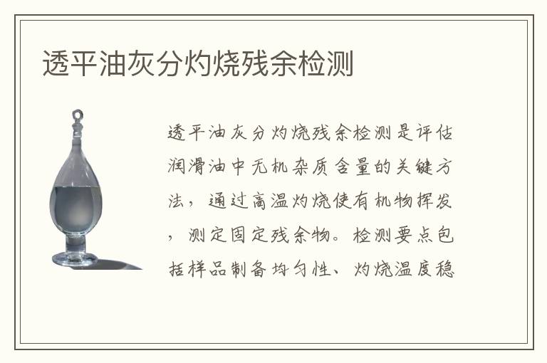 透平油灰分灼燒殘余檢測(cè)是評(píng)估潤(rùn)滑油中無機(jī)雜質(zhì)含量的關(guān)鍵方法,通過高溫灼燒使有機(jī)物揮發(fā),測(cè)定固定殘余物。檢測(cè)要點(diǎn)包括樣品制備均勻性、灼燒溫度穩(wěn)定性、時(shí)間控制精確性以及殘余物稱量準(zhǔn)確性,確保結(jié)果可靠反映油品純凈度與使用性能。