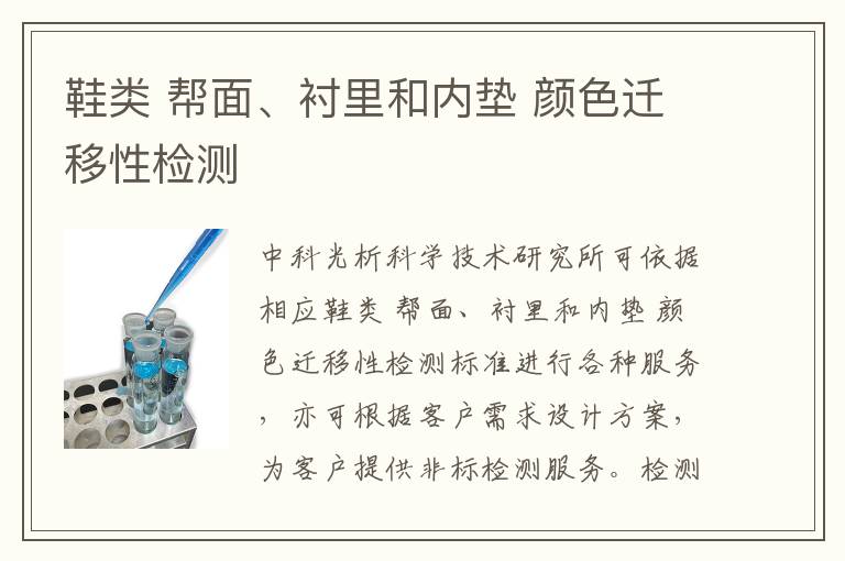 關(guān)鍵詞:鞋類幫面、襯里和內(nèi)墊顏色遷移性測(cè)試方法,鞋類幫面、襯里和內(nèi)墊顏色遷移性測(cè)試案例,鞋類幫面、襯里和內(nèi)墊顏色遷移性測(cè)試機(jī)構(gòu)