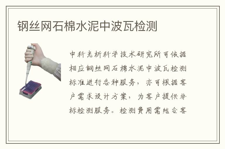 鋼絲網(wǎng)石棉水泥中波瓦檢測涉及材料物理性能、化學成分及安全性的綜合評估,重點包括抗壓強度、彎曲性能、石棉含量分析和鋼絲網(wǎng)完整性測試,確保產品符合建筑應用標準與安全要求。