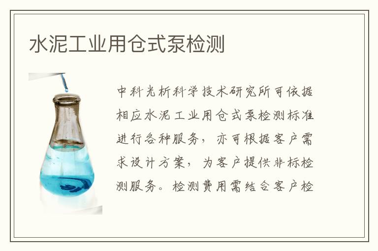水泥工業(yè)用倉式泵檢測涵蓋泵體結(jié)構(gòu)、密封性能、流量和壓力等關(guān)鍵項目,確保設(shè)備在高壓、高磨損環(huán)境下的安全運行。檢測要點包括材料耐久性、運行參數(shù)驗證和標(biāo)準(zhǔn)符合性,以提升設(shè)備可靠性和效率。